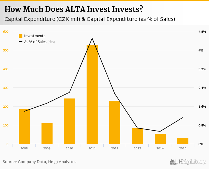 ALTA Invest invested a total of CZK 29.9 mil in 2015, down 44.3% compared to the previous year. Historically, between 2008 - 2015, the company's investments stood at a high of CZK 527 mil in 2011 and a low of CZK 29.9 mil in 2015.