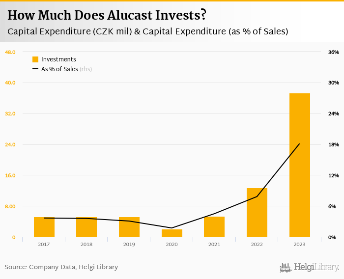 Alucast invested a total of CZK 37.3 mil in 2023, up 194% compared to the previous year. Historically, between 2017 - 2023, the company's investments stood at a high of CZK 37.3 mil in 2023 and a low of CZK 2.05 mil in 2020.