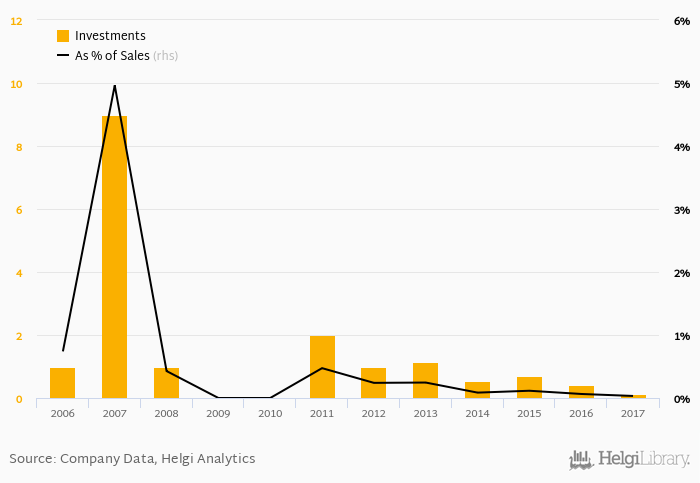 As a percentage of total sales, investments stood at 0.032% in 2017, down from 0.064% as seen in the previous year. This is compared to an average of 0.108% over the last five years.