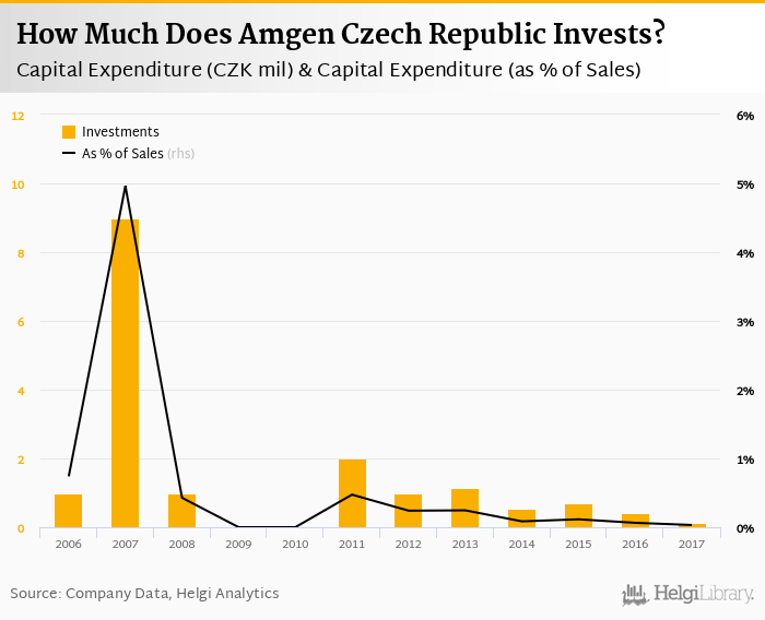 Amgen Czech Republic invested a total of CZK 0.135 mil in 2017, down 66.3% compared to the previous year. Historically, between 2006 - 2017, the company's investments stood at a high of CZK 9.00 mil in 2007 and a low of CZK 0 mil in 2010.