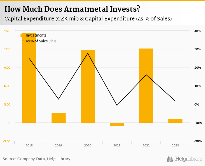 Armatmetal invested a total of CZK 0.658 mil in 2023, down 94.6% compared to the previous year. Historically, between 2018 - 2023, the company's investments stood at a high of CZK 14.7 mil in 2018 and a low of CZK -0.483 mil in 2021.