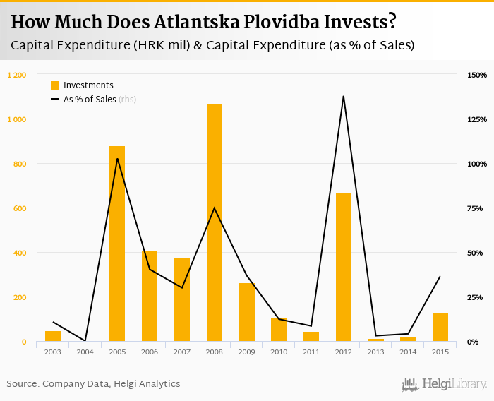 Atlantska Plovidba invested a total of HRK 128 mil in 2015, up 580% compared to the previous year. Historically, between 2003 - 2015, the company's investments stood at a high of HRK 1,069 mil in 2008 and a low of HRK 0 mil in 2004.