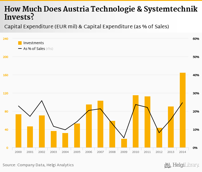 Austria Technologie & Systemtechnik invested a total of EUR 165 mil in 2014, up 81.3% compared to the previous year. Historically, between 2000 - 2014, the company's investments stood at a high of EUR 165 mil in 2014 and a low of EUR 19.7 mil in 2009.