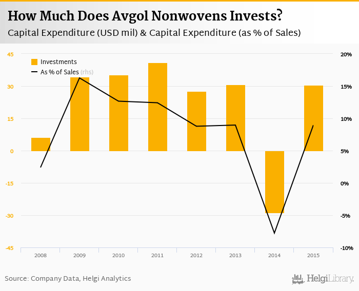 Avgol Nonwovens invested a total of USD 30.5 mil in 2015, up 206% compared to the previous year. Historically, between 2008 - 2015, the company's investments stood at a high of USD 40.9 mil in 2011 and a low of USD -28.7 mil in 2014.