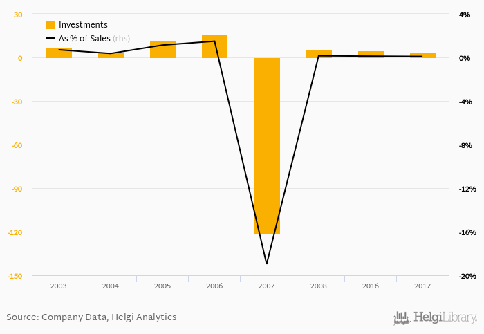As a percentage of total sales, investments stood at 0.088% in 2017, down from 0.114% as seen in the previous year. This is compared to an average of 0.101% over the last five years.