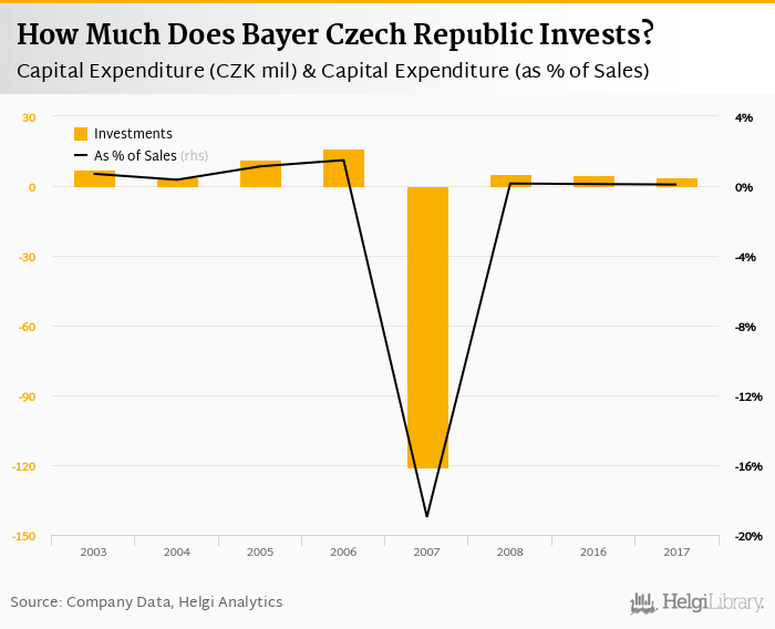 Bayer Czech Republic invested a total of CZK 3.68 mil in 2017, down 25.2% compared to the previous year. Historically, between 2003 - 2017, the company's investments stood at a high of CZK 16.1 mil in 2006 and a low of CZK -121 mil in 2007.