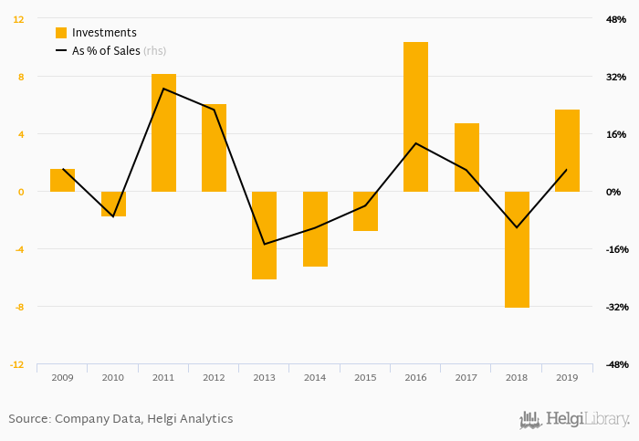 As a percentage of total sales, investments stood at 6.04% in 2019, up from -10.2% as seen in the previous year. This is compared to an average of 2.14% over the last five years.