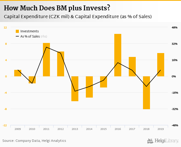 BM plus invested a total of CZK 5.73 mil in 2019, up 171% compared to the previous year. Historically, between 2009 - 2019, the company's investments stood at a high of CZK 10.4 mil in 2016 and a low of CZK -8.07 mil in 2018.