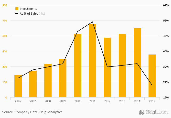 As a percentage of total sales, investments stood at 22.3% in 2015, down from 33.5% as seen in the previous year. This is compared to an average of 35.1% over the last five years.