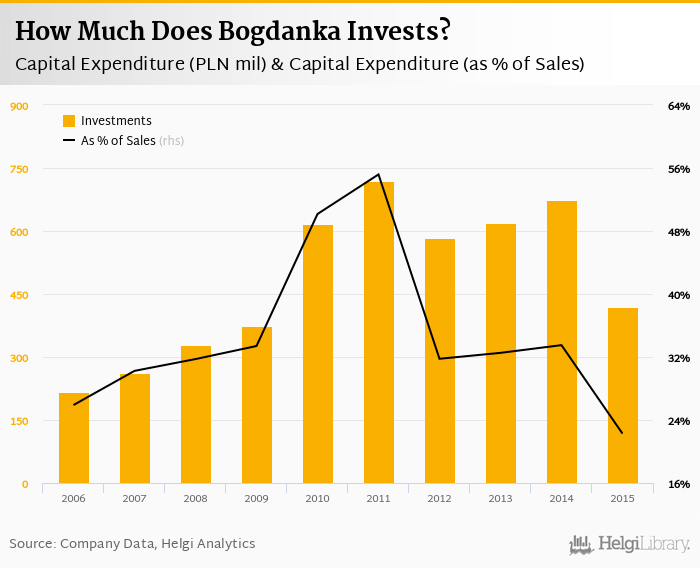 Bogdanka invested a total of PLN 419 mil in 2015, down 37.7% compared to the previous year. Historically, between 2006 - 2015, the company's investments stood at a high of PLN 718 mil in 2011 and a low of PLN 217 mil in 2006.