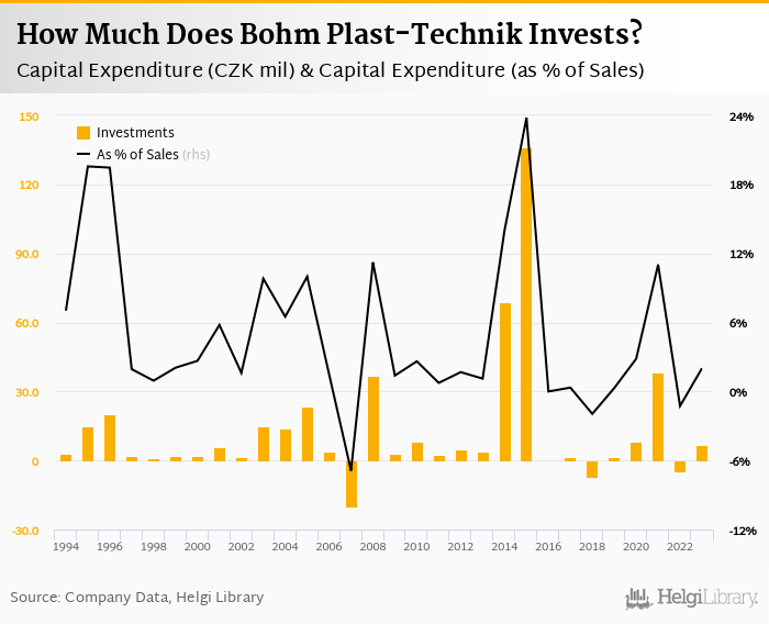Bohm Plast-Technik invested a total of CZK 6.84 mil in 2023, up 239% compared to the previous year. Historically, between 1994 - 2023, the company's investments stood at a high of CZK 136 mil in 2015 and a low of CZK -20.0 mil in 2007.