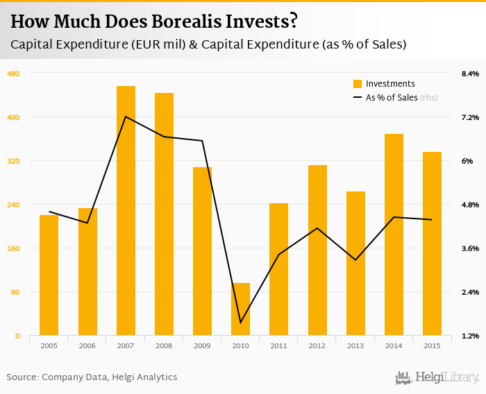 Borealis invested a total of EUR 336 mil in 2015, down 9.04% compared to the previous year. Historically, between 2005 - 2015, the company's investments stood at a high of EUR 457 mil in 2007 and a low of EUR 97.0 mil in 2010.