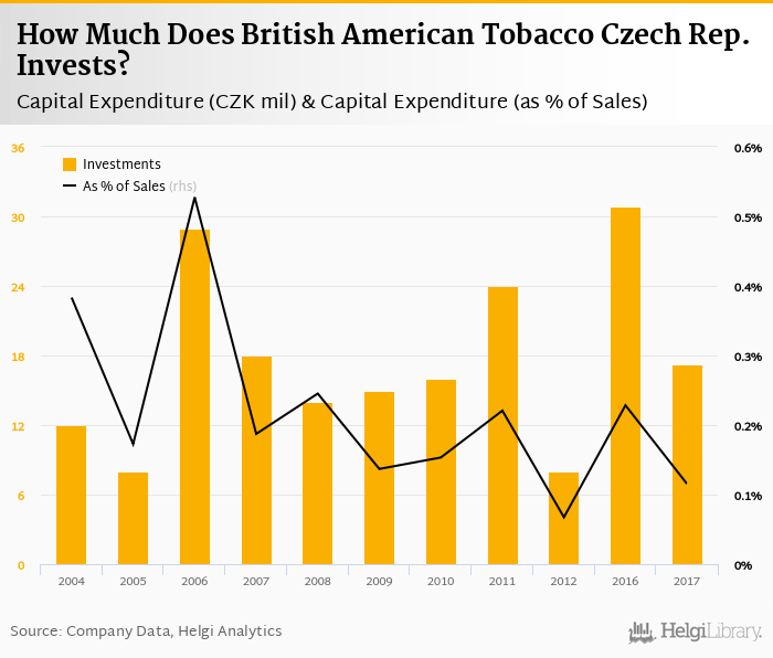 As far as British American Tobacco Czech Rep.'s peers are concerned, Imperial Tobacco Czech Republic invested CZK 44.0 mil, or 0.396% of its sales in 2017. Comparable figures for Philip Morris Czech Republic are CZK 628 mil and 5.15%.