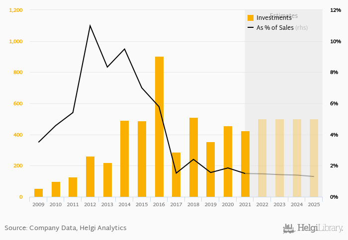 As a percentage of total sales, investments stood at 1.49% in 2021, down from 1.85% as seen in the previous year. This is compared to an average of 1.77% over the last five years.