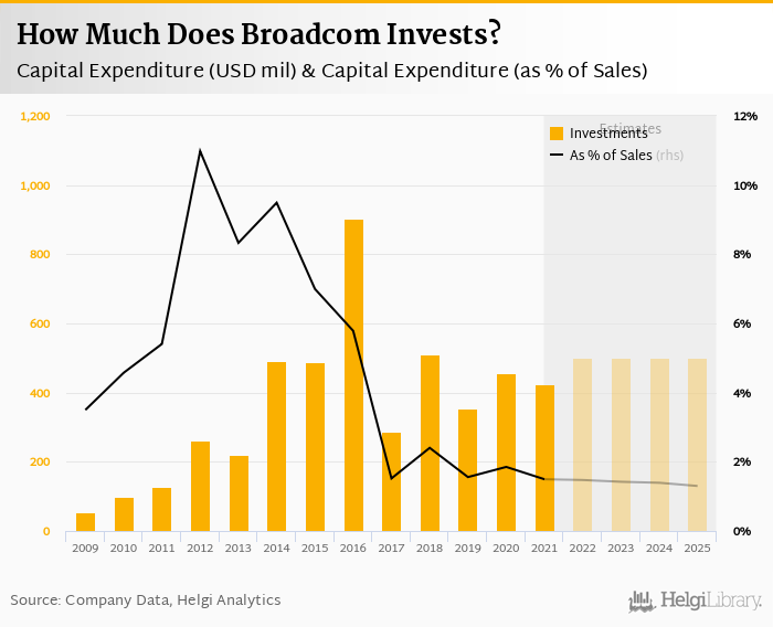 Broadcom invested a total of USD 426 mil in 2021, down 6.78% compared to the previous year. Historically, between 2009 - 2021, the company's investments stood at a high of USD 903 mil in 2016 and a low of USD 55.0 mil in 2009.