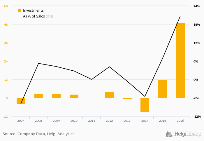 As a percentage of total sales, investments stood at 20.7% in 2016, up from 6.87% as seen in the previous year. This is compared to an average of 5.10% over the last five years.