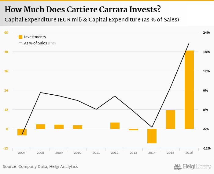 Cartiere Carrara invested a total of EUR 48.8 mil in 2016, up 317% compared to the previous year. Historically, between 2007 - 2016, the company's investments stood at a high of EUR 48.8 mil in 2016 and a low of EUR -8.96 mil in 2014.