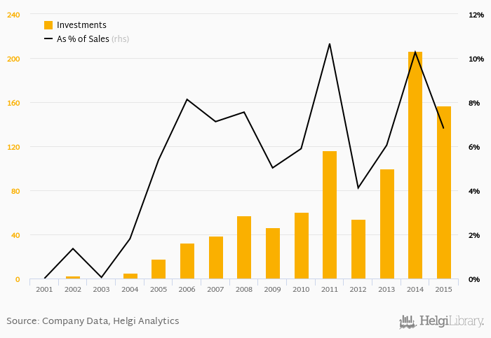 As a percentage of total sales, investments stood at 6.80% in 2015, down from 10.3% as seen in the previous year. This is compared to an average of 7.58% over the last five years.