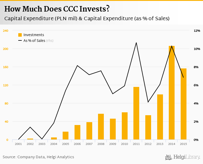 As far as CCC's peers are concerned, LPP invested PLN 491 mil, or 9.56% of its sales in 2015. Comparable figures for Eurocash are PLN 168 mil and 0.824%.
