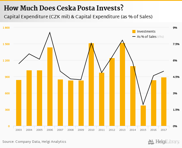 Ceska Posta invested a total of CZK 889 mil in 2017, up 5.96% compared to the previous year. Historically, between 2003 - 2017, the company's investments stood at a high of CZK 1,520 mil in 2013 and a low of CZK 375 mil in 2015.