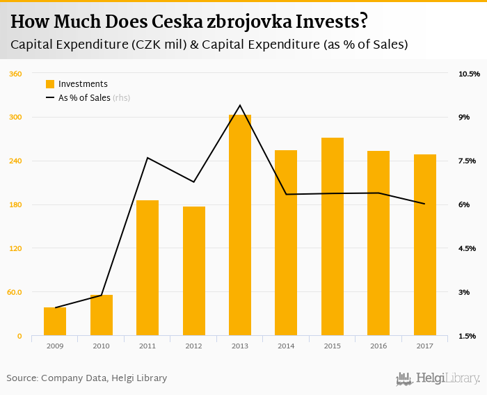 As far as Ceska zbrojovka's peers are concerned, Omnipol invested CZK 191 mil, or 28.2% of its sales in 2017. Comparable figures for Excalibur Army are CZK 110 mil and 5.26%.
