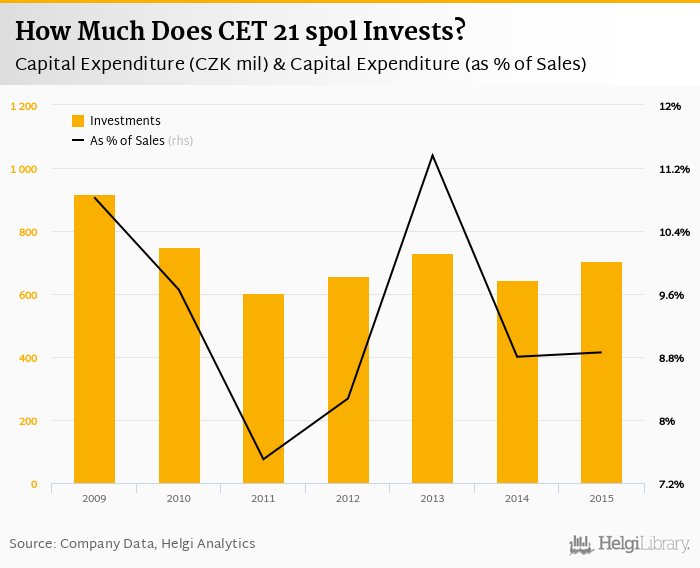 CET 21 spol invested a total of CZK 704 mil in 2015, up 9.14% compared to the previous year. Historically, between 2009 - 2015, the company's investments stood at a high of CZK 916 mil in 2009 and a low of CZK 603 mil in 2011.