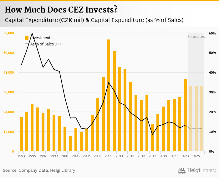 CEZ invested a total of CZK 44,360 mil in 2023, up 34.3% compared to the previous year. Historically, between 1993 - 2023, the company's investments stood at a high of CZK 68,236 mil in 2009 and a low of CZK 9,323 mil in 2002.