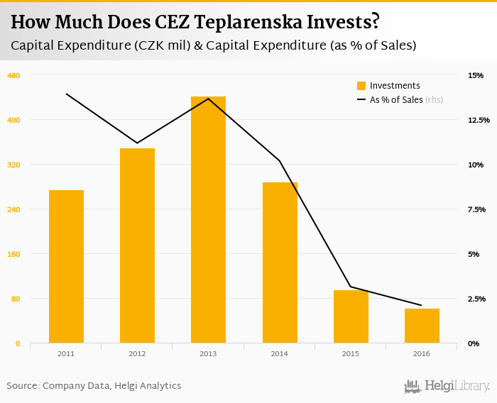 CEZ Teplarenska invested a total of CZK 61.8 mil in 2016, down 34.8% compared to the previous year. Historically, between 2011 - 2016, the company's investments stood at a high of CZK 441 mil in 2013 and a low of CZK 61.8 mil in 2016.