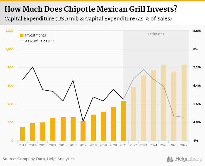 Chipotle Mexican Grill invested a total of USD 438 mil in 2021, up 17.4% compared to the previous year. Historically, between 2011 - 2021, the company's investments stood at a high of USD 438 mil in 2021 and a low of USD 151 mil in 2011.