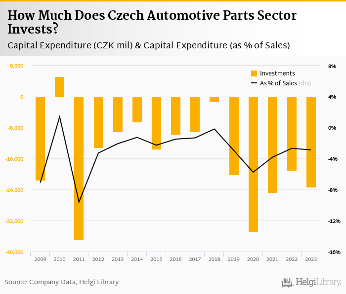 Czech Automotive Parts Sector invested a total of CZK -23,295 mil in 2023, down 23% compared to the previous year. Historically, between 2009 - 2023, the company's investments stood at a high of CZK 5,173 mil in 2010 and a low of CZK -36,966 mil in 2011.
