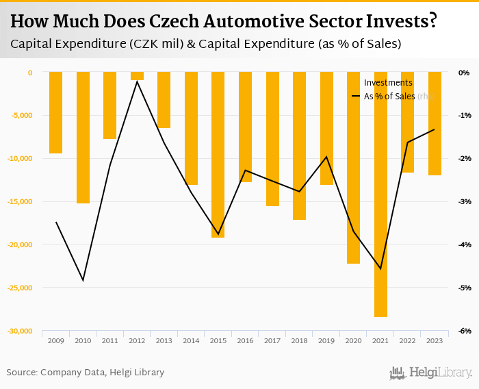 Czech Automotive Sector invested a total of CZK -11,962 mil in 2023, down 2.95% compared to the previous year. Historically, between 2009 - 2023, the company's investments stood at a high of CZK -876 mil in 2012 and a low of CZK -28,447 mil in 2021.