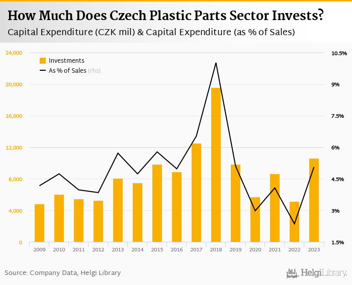 Czech Plastic Parts Sector invested a total of CZK 10,647 mil in 2023, up 106% compared to the previous year. Historically, between 2009 - 2023, the company's investments stood at a high of CZK 19,583 mil in 2018 and a low of CZK 4,844 mil in 2009.