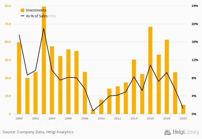 As a percentage of total sales, investments stood at 1.22% in 2020, down from 5.52% as seen in the previous year. This is compared to an average of 6.81% over the last five years.