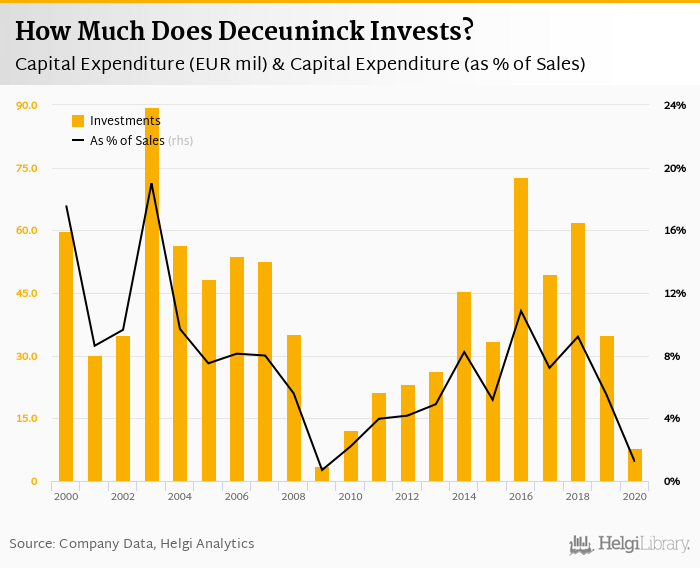 Deceuninck invested a total of EUR 7.86 mil in 2020, down 77.5% compared to the previous year. Historically, between 2000 - 2020, the company's investments stood at a high of EUR 89.4 mil in 2003 and a low of EUR 3.54 mil in 2009.