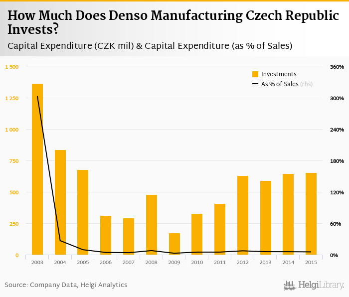 Denso Manufacturing Czech Republic invested a total of CZK 654 mil in 2015, up 1.12% compared to the previous year. Historically, between 2002 - 2015, the company's investments stood at a high of CZK 1,364 mil in 2003 and a low of CZK 176 mil in 2009.