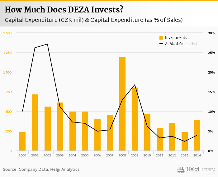 As far as DEZA's peers are concerned, Synthos Kralupy invested CZK 93.1 mil, or 0.508% of its sales in 2014. Comparable figures for Grupa Azoty are PLN 676 mil and 6.83%.