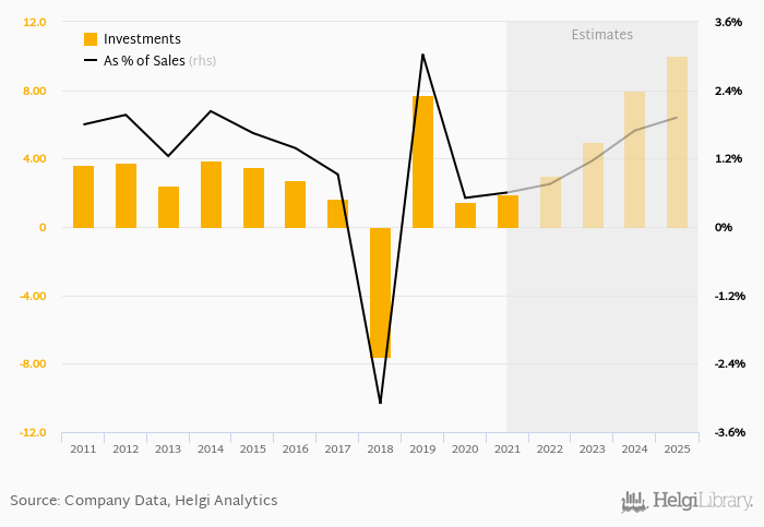 As a percentage of total sales, investments stood at 0.605% in 2021, up from 0.510% as seen in the previous year. This is compared to an average of 0.393% over the last five years.