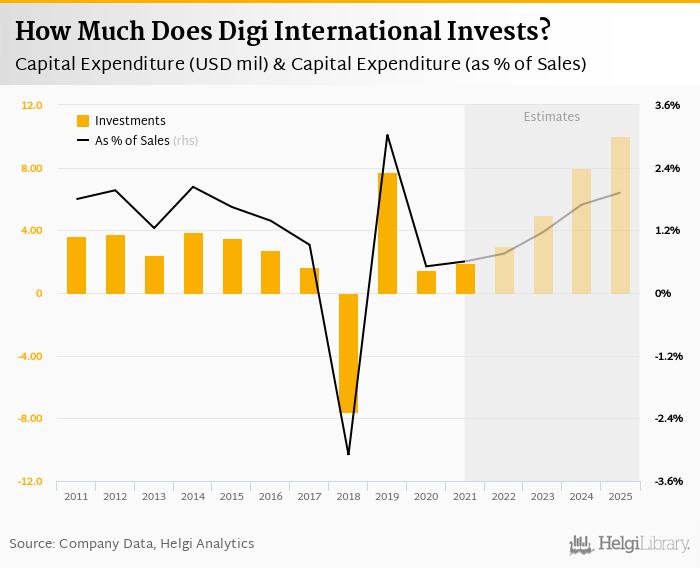 Digi International invested a total of USD 1.93 mil in 2021, up 30.7% compared to the previous year. Historically, between 2011 - 2021, the company's investments stood at a high of USD 7.71 mil in 2019 and a low of USD -7.61 mil in 2018.