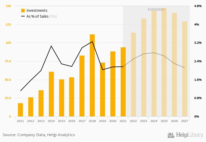 As a percentage of total sales, investments stood at 2.16% in 2021, up from 2.15% as seen in the previous year. This is compared to an average of 2.51% over the last five years.