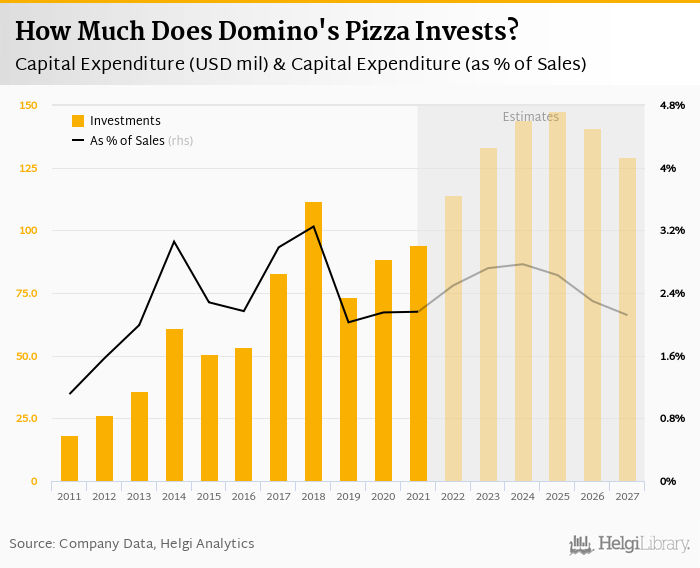 Domino's Pizza invested a total of USD 94.2 mil in 2021, up 6.28% compared to the previous year. Historically, between 2011 - 2021, the company's investments stood at a high of USD 112 mil in 2018 and a low of USD 18.3 mil in 2011.