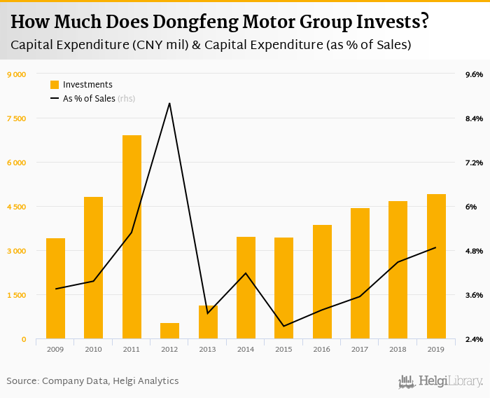 As far as Dongfeng Motor Group's peers are concerned, Chongqing Changan Automobile invested CNY 4,711 mil, or 6.67% of its sales in 2019. Comparable figures for SAIC Motor Corporation are CNY 25,079 mil and 2.97%.