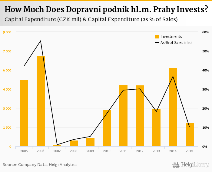 Dopravni podnik hl.m. Prahy invested a total of CZK 1,828 mil in 2015, down 70.5% compared to the previous year. Historically, between 2005 - 2015, the company's investments stood at a high of CZK 7,110 mil in 2006 and a low of CZK 105 mil in 2007.