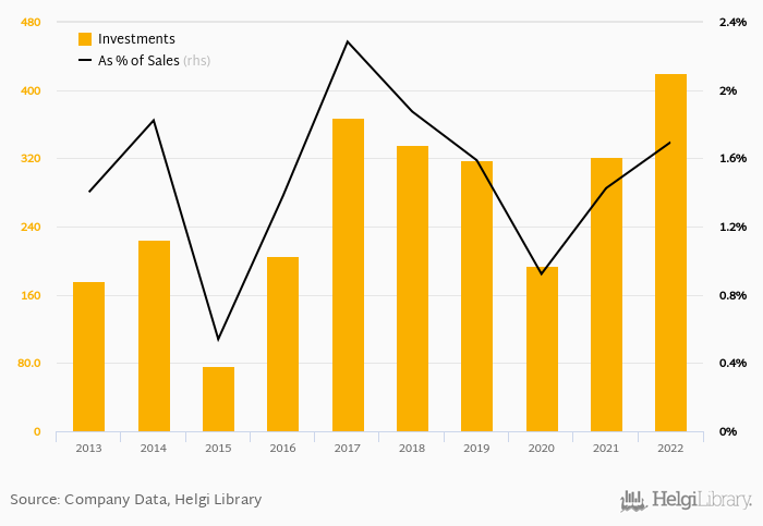 As a percentage of total sales, investments stood at 1.69% in 2022, up from 1.42% as seen in the previous year. This is compared to an average of 1.50% over the last five years.