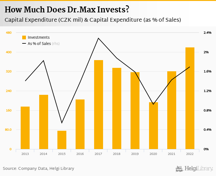 Dr.Max invested a total of CZK 420 mil in 2022, up 30.7% compared to the previous year. Historically, between 2013 - 2022, the company's investments stood at a high of CZK 420 mil in 2022 and a low of CZK 76.4 mil in 2015.