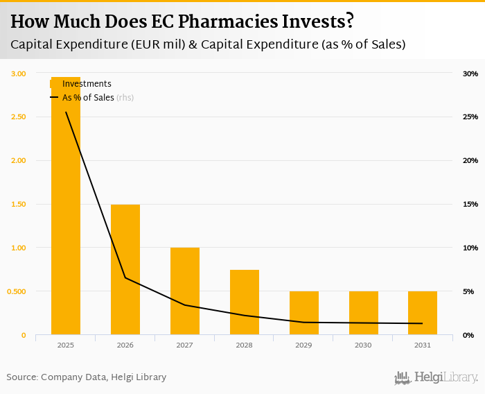 EC Pharmacies invested a total of in , down 0% compared to the previous year. Historically, between 2025 - , the company's investments stood at a high of EUR 2.96 mil in 2025 and a low of EUR 0.500 mil in 2031.