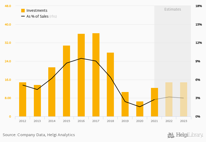 As a percentage of total sales, investments stood at 2.75% in 2021, up from 1.57% as seen in the previous year. This is compared to an average of 4.43% over the last five years.