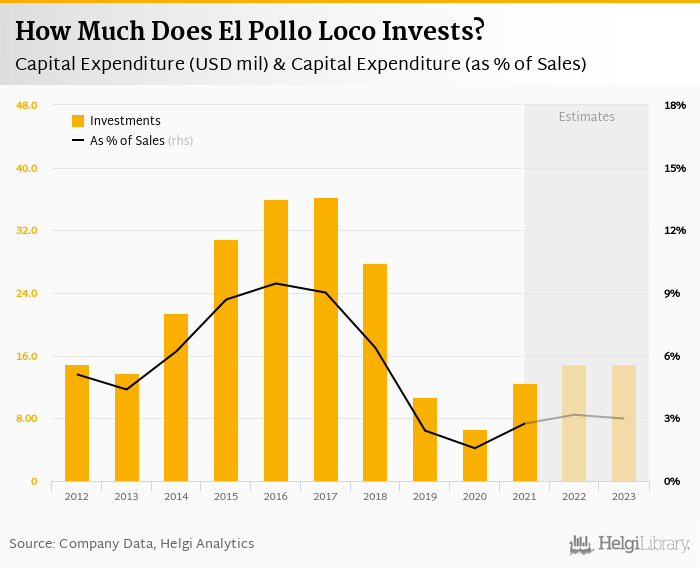 El Pollo Loco invested a total of USD 12.5 mil in 2021, up 86.6% compared to the previous year. Historically, between 2012 - 2021, the company's investments stood at a high of USD 36.2 mil in 2017 and a low of USD 6.69 mil in 2020.
