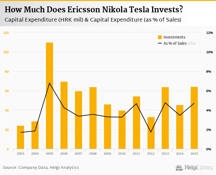 Ericsson Nikola Tesla invested a total of HRK 64.2 mil in 2015, up 41.9% compared to the previous year. Historically, between 2003 - 2015, the company's investments stood at a high of HRK 110 mil in 2005 and a low of HRK 24.1 mil in 2003.