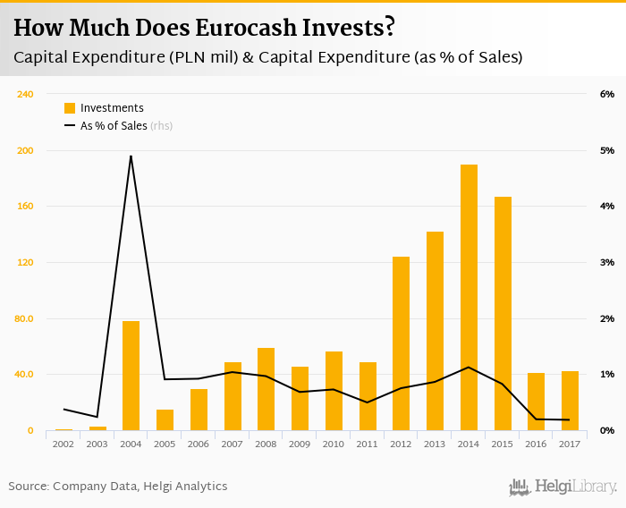 Eurocash invested a total of PLN 42.9 mil in 2017, up 3.69% compared to the previous year. Historically, between 2002 - 2017, the company's investments stood at a high of PLN 191 mil in 2014 and a low of PLN 1.03 mil in 2002.
