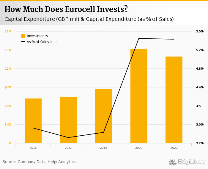 Eurocell invested a total of GBP 14.0 mil in 2020, down 7.89% compared to the previous year. Historically, between 2016 - 2020, the company's investments stood at a high of GBP 15.2 mil in 2019 and a low of GBP 7.22 mil in 2016.